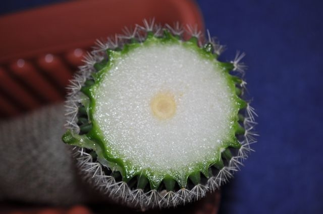 2 этап: Если кактус, после пыток, сильно осел и сморщился, то можно подождать по дольше. Пока он не напьется воды и не восстановит силы. Если и так здоровый шо кабан, то ждем подсыхания среза и режем дальше. Может даже понадобится маленькая пилка, если сосуды очень уж крепкие. Ну и режем дальше уже окончательно. После чего подсушиваем срез и ставим вертикально в светлое место, но чтоб кактус не перегревался и не терял лишнюю воду. И каждую минуту его теребим глядя где там корни. Смиренно ждем корни... неделю, месяц .. год... Чем старше кактус, тем менее охотно он может давать корни.