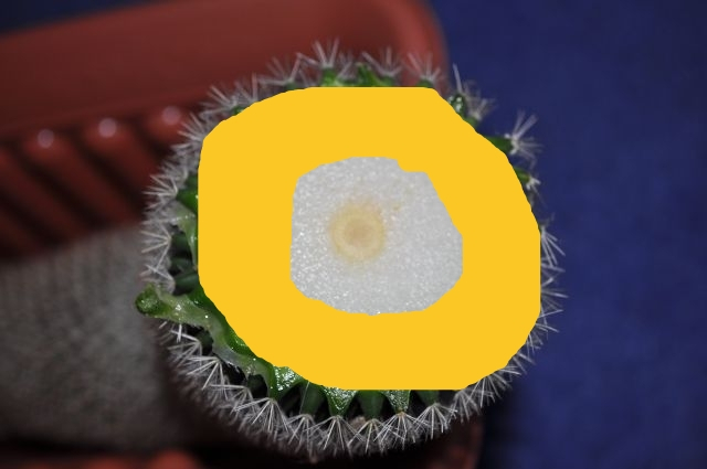 Зона надреза желтая. Так мы сделаем уже часть работы, но кактус будет получать питание через проводящие пучки. После чего надо поставить его в неплохо проветриваемое место (без сквозняка). Чтобы срезы не стояли сырыми, а быстро начали подсыхать.