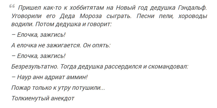 Гэндальф оказывается на новогоднем празднике и, видимо, вместо традиционных праздничных слов, использует заклинание из книги – "Нару анн адриат аммин!", что в переводе с синдарина (одного из эльфийских языков, придуманных Толкиеном) означает "Огонь для всех нас!".