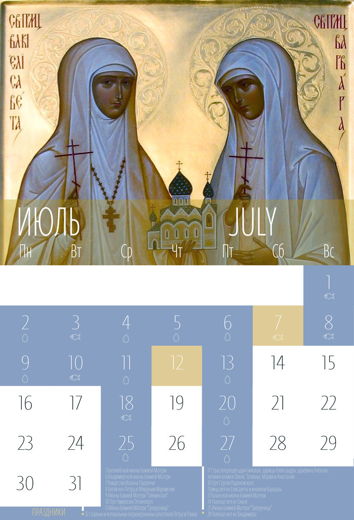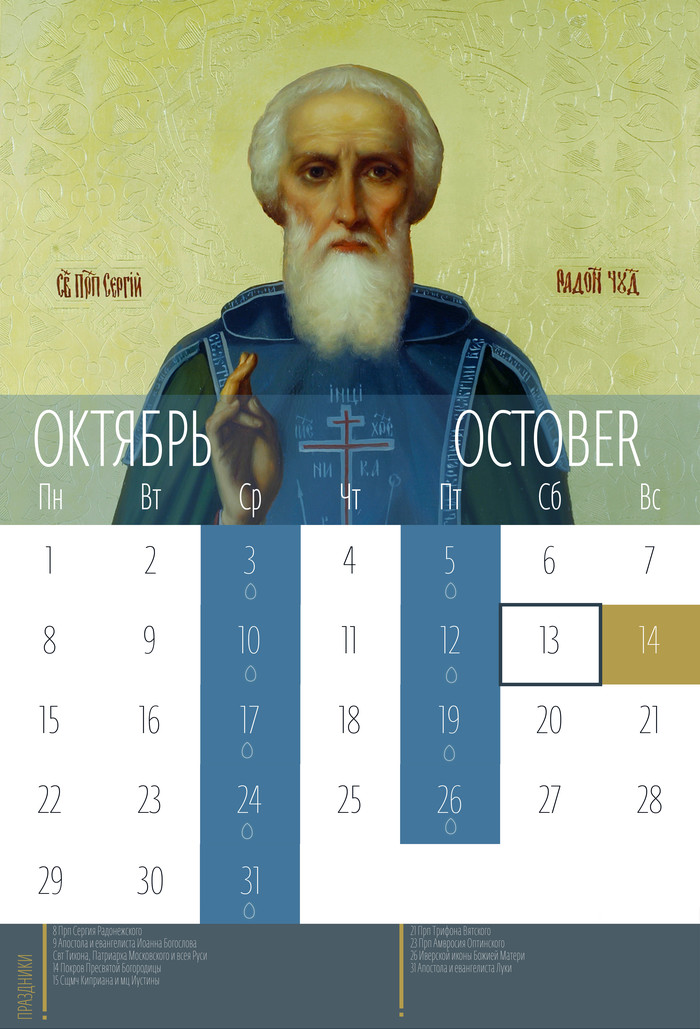 Цветом выделенные блоки - это определенные дни праздников и постных дней.
