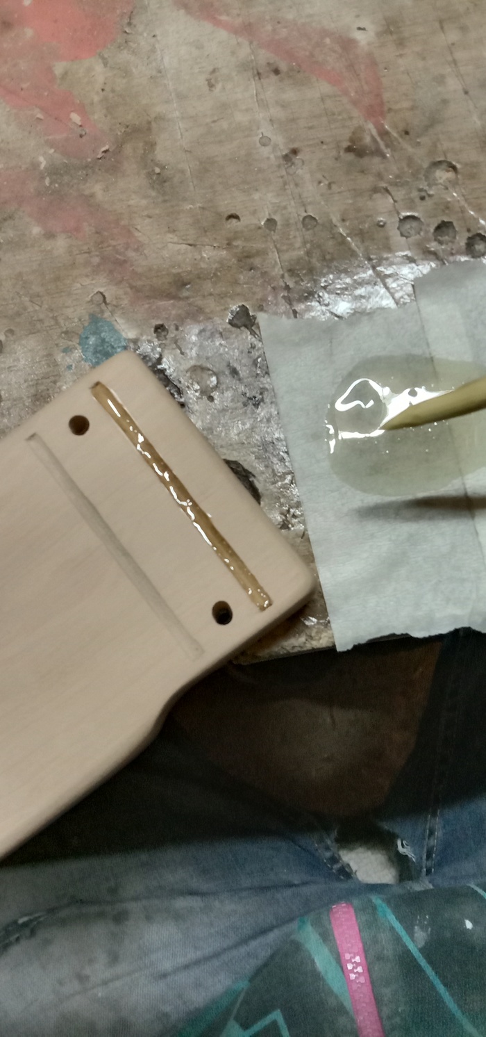 Далее подклейка усиливающей части, в месте где крепится саморезами дека. По отзывам часто саморезы ломают доску, так что лучше сделать усиление.