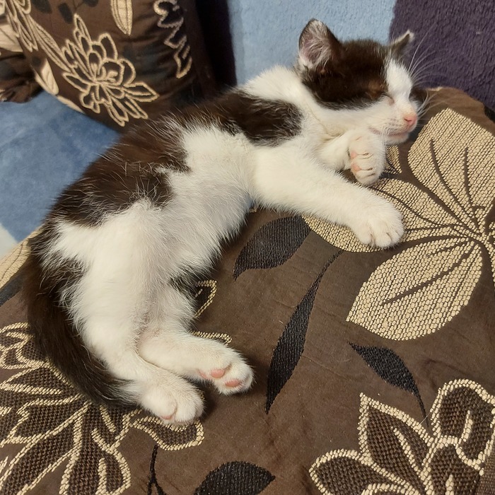 Накормили, обработали носик и глазки. Примерно определили возраст. Ей всего полтора месяца. Вот она на утро следующего дня.