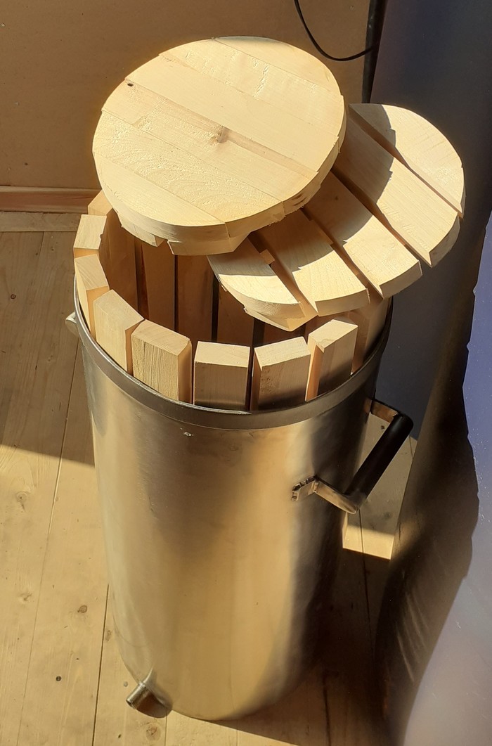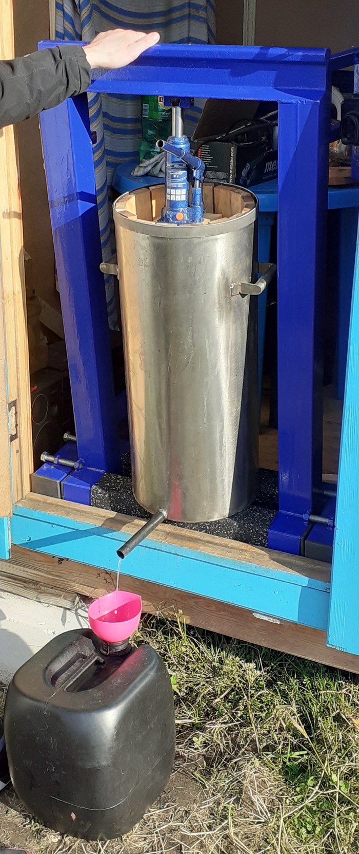 Цель этого этапа, чтобы мезга отстоялась и начала выпускать сок для дальнейшего повышения сокоотдачи при отжиме. При изготовлении сидра на этом этапе в мезгу можно подсыпать сахар. Напиток получится крепче, а сокоотделение мезги пройдет быстрее. Так же важно оградить мезгу от доступа кислорода (я пакетом накрывал) потому что фрукты быстро окисляются, при этом меняя цвет и вкус.