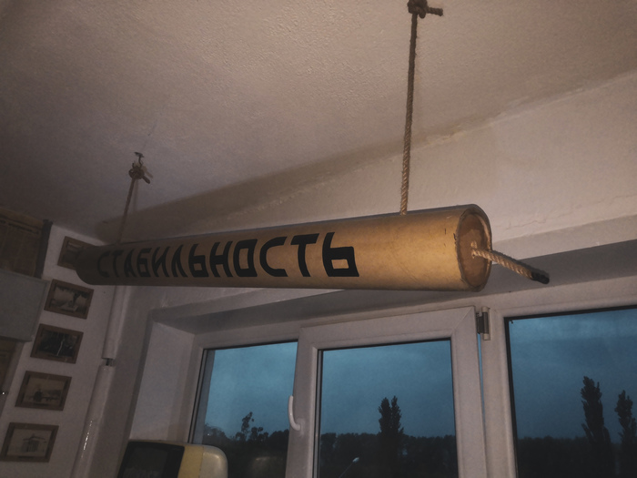 Под потолком теперь криво-косо, но висит "Стабильность". Когда первый вопрос от соседей прозвучал как "А не прибьёт?" мы прямо поняли, что задумка реализована в полной мере. Тут даже комментировать особо не нужно.