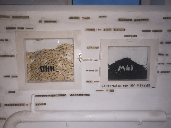 С форточками тоже неплохая задумка. "ОНИ - МЫ" - прекрасное отражение многих процессов в стране. Вон, скоро выборы, и кандидатами от Единой России завешан каждый столб (хоть на людей еще не клеят). Какая же партия снова получит конституционное большинство? - Логично какая, ибо по статистике ЦИКа, ЕдРо набирает какой раз подряд за 70% голосов, а кого не спросишь - люди выступают против... Помните, нас не меньше, мы просто используемся.