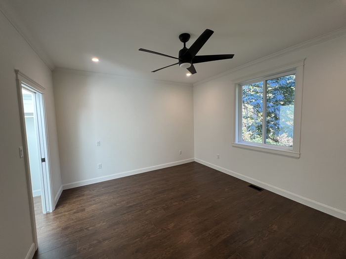 Ещё одна спальня второго этажа. В доме есть кондиционер (и тепловой насос), но плюс в спальне есть и вентилятор в потолке. Теплый/холодный воздух поступает из "вентиляции" на полах (видно решётку).