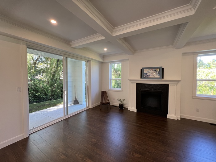 Высокие потолки на обоих этажах. Красивый и дорогой потолок. Много окон и света. Огромные двери на патио. Газовый камин.