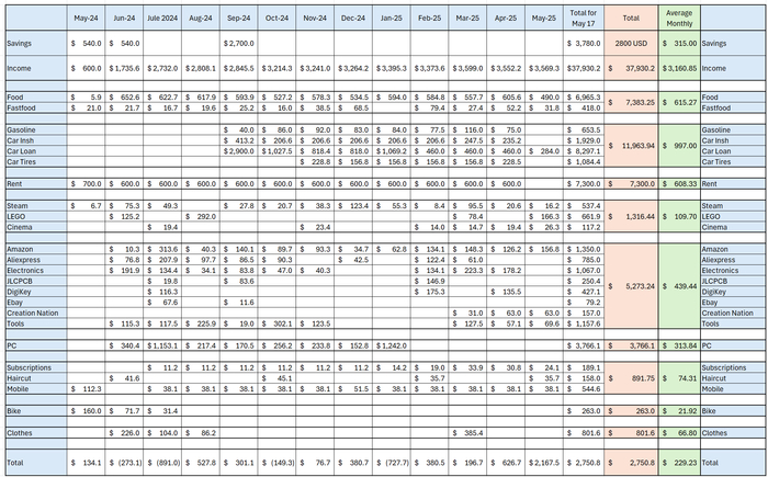 Для тех, кому лениво листать до конца, напишу сразу вывод: Всё хорошо, жить можно, денег хватает, денег не накопил, но купил очень много барахла).