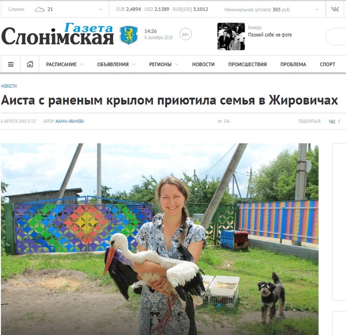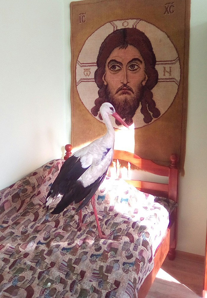 Как-то раз, в процессе работы, мне позвонила жена и сказала, что нам принесли... Аиста! У него была оторвана половина крыла, был он грязный и голодный. Терзаемый подозрениями, я побежал домой и в своей комнате увидел такую картину:
