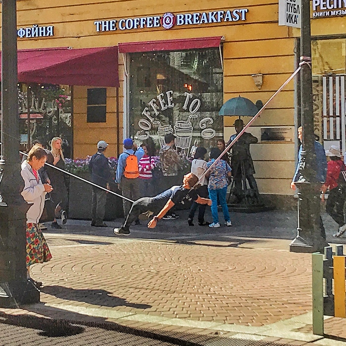Выступление канатоходца прошло в рамках празднования 315-летия Санкт-Петербурга. Канат был натянут между частями разведённого моста.По словам Абакарова, идея трюка родилась после того, как он застрял ночью на Васильевском острове из-за разведенных мостов. Подготовка велась около двух месяцев. Канатоходец пообещал в следующий раз выполнить более грандиозный трюк.