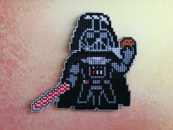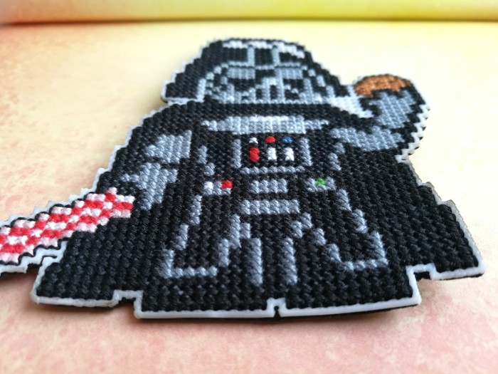 Работа вышита крестом на пластиковой канве с использованием ниток мулине. Задняя часть работы закрыта чёрным фетром, и туда же спрятан магнит. На работу ушло примерно дня 3-4, выполнено такое впервые. Сейчас живёт на холодильнике 😀