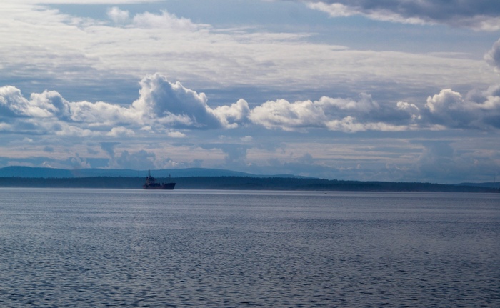 Итак, мы в полном снаряжении. Ощущения очень необычные. На улице крепкий мороз, края залива замерзли, а мы идем к парящему от разницы температур Белому морю.