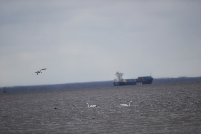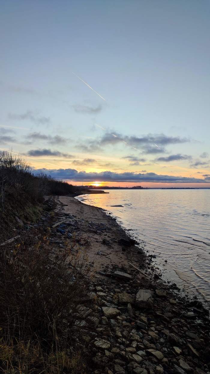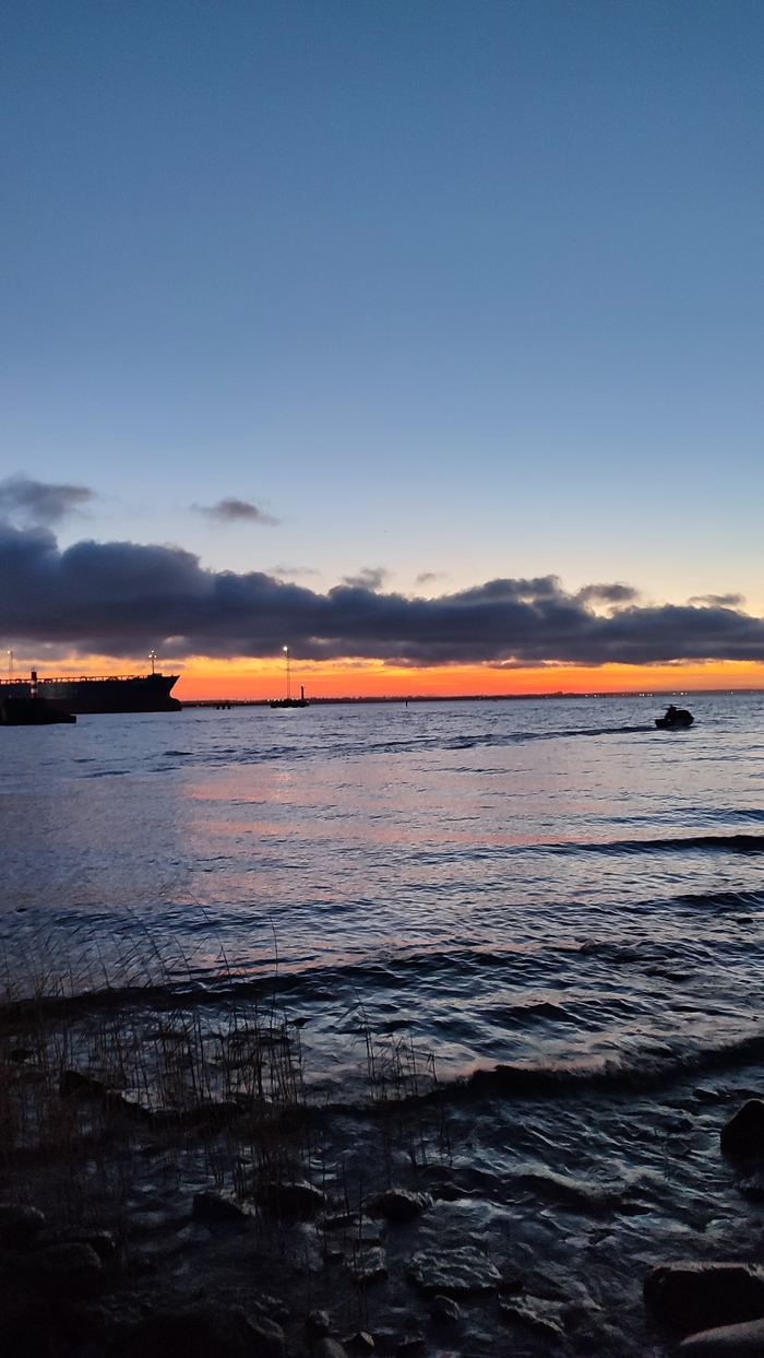 Ну и в финальной точке вас ждёт красивый закат (с заваленным горизонтом в моём случае), если подгадали время, ну и ещё пронизывающий до костей ветер, как бы вы не подгадывали время. Где-то в порту ещё есть стелла «Ленинград», но она смотрит на залив и видна судам, которые заходят в порт, так что с берега разглядеть её не получится.