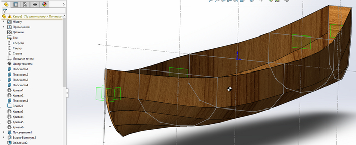 Вытягиваем фигуру по сечениям и создаем оболочку 3д-оболчку из 3мм. Задаем в свойствах материал сходных по плотности с фанерой, пригодится для подсчета массы.