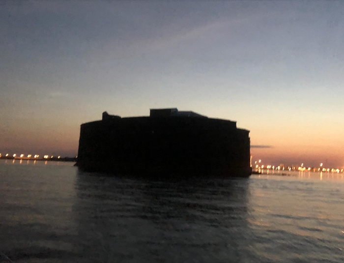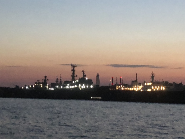 В Кронштадте южный фарватер ещё сложнее)) мне Гена объяснил когда и куда, но я не ожидала такого количества мелей у фортов и ширины фарватера 10-20 метров. Высадиться уже было нельзя: было за полночь, а подход к фортам на нашем Дизеле даже днём сложноват. Шли мы очень малым ходом и старались держаться подальше от больших кораблей. Типа вот этого ледокола, кстати, я впервые увидела ледокол на ходу)