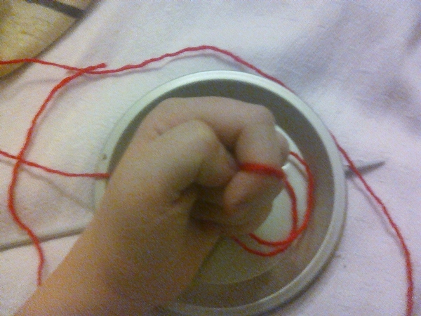 Снова принимаем боевую стойку чтобы петелька была на сгибе пальца. Суём крючок в петельку, берём нитку на пальце и тянем в петлю.