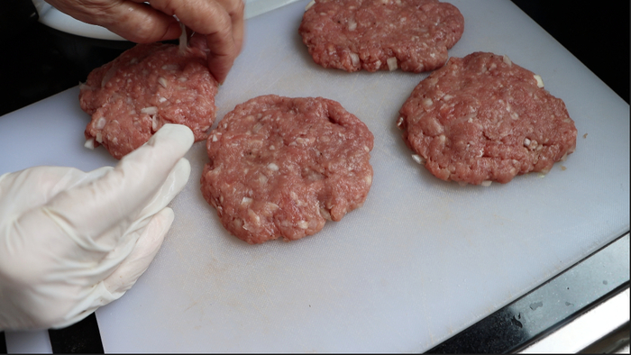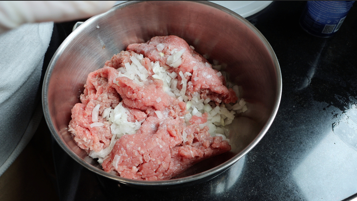 1. К говяжьему фаршу добавляем мелко порубленную луковицу, соль и перец. Все хорошо перемешиваем.