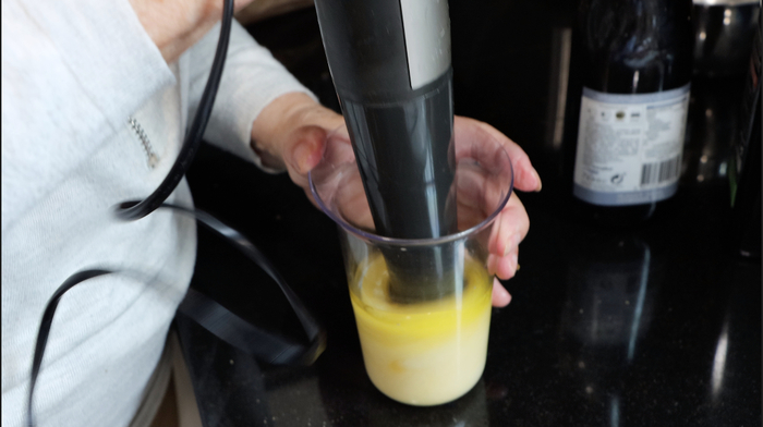 3. Соус айоли: в стакан для блендера разбиваем яйцо, добавляем 1 зубчик чеснока, щепотку соли и масло. Блендер опускаем на дно стакана, включаем и не отрываем от дна. Очень быстро у нас получается майонез.