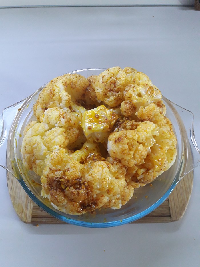 Сто грамм сливочного масла растопил, смешал с четырьмя столовыми ложками оливкового масла. Добавил два зубчика чеснока мелко порезанного, 1/2 ч.л. кариандра молотого, 1/2 ч.л. куркумы молотой, 1/4 ч.л. перца чили в хлопьях, 1/4 ч.л. черного перца молотого, 1/3 ч.л. соли. - перемешать.