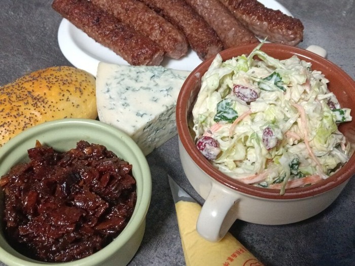 В этот раз приготовим разновидность коул слоу, а именно - blue cheese coleslaw. Неповторимое сочетание вкусов и текстур: сочная колбаска в мягкой булочке, идеально сочетается со солено-сладким джемом, нежным салатом из хрустящей капусты, сочной моркови и ароматной зелени, приправленной майонезом и дижонской горчицей. А вкуснейший голубой сыр и сладкий клюква добавляют нотки изысканности и необычности этому блюду.
