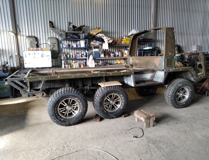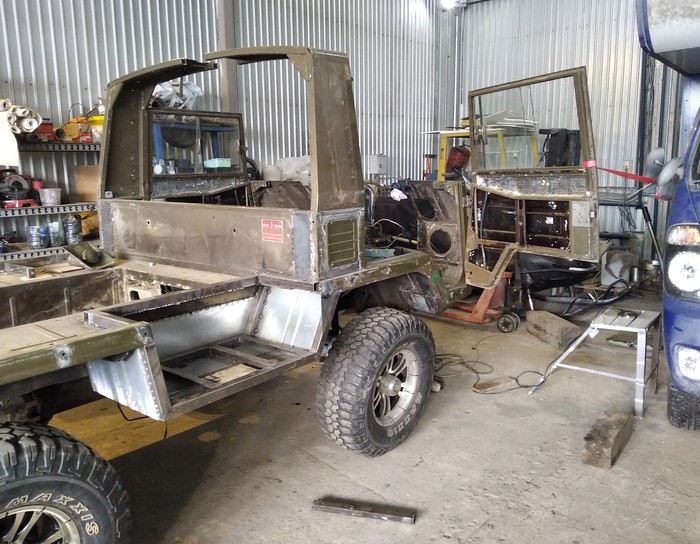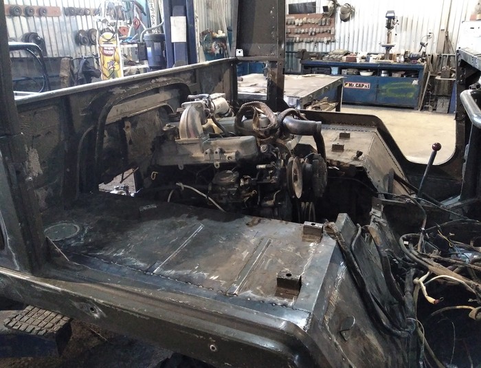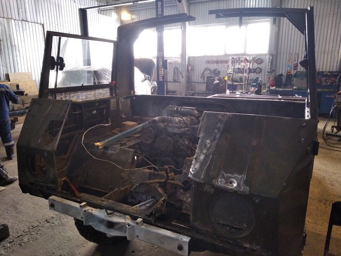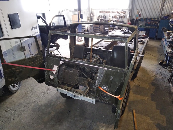 Прошлый раз мы с вами закончили на сварных работах. И так, продолжим, очередная установка кузова на шасси автомобиля сегодня для примерки двигателя. На заводе на подобные автомобили устанавливается двух карбюраторный двигатель воздушного охлаждения, бензиновый. К современным реалиям он не подходит совершенно, малая мощность, низкий крутящий момент и большой расход топлива. Поэтому было решено установить дизельный двигатель td27t со своей пятиступенчатой коробкой переключения передач.