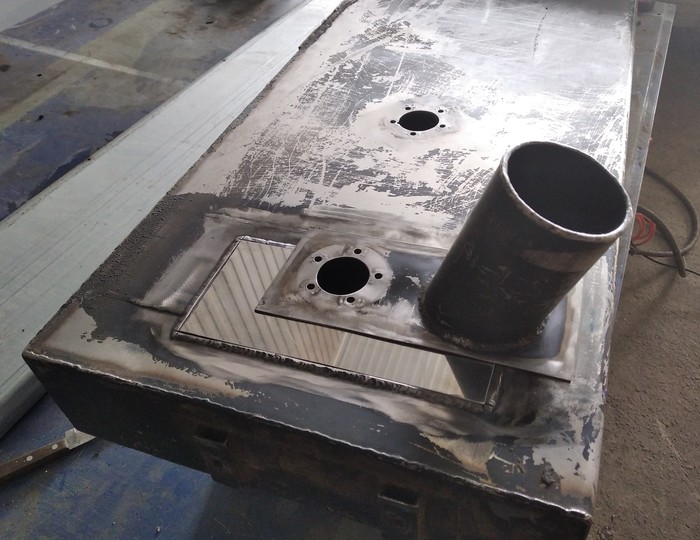 Для переноса топливного бака нужно переварить его заливную горловину. Сам бак из нержавеющей стали на 130 л, по расчётам этого запаса топлива должно хватить почти на 1000 км пути. Лючок для заливки топлива также переносится на левую сторону.