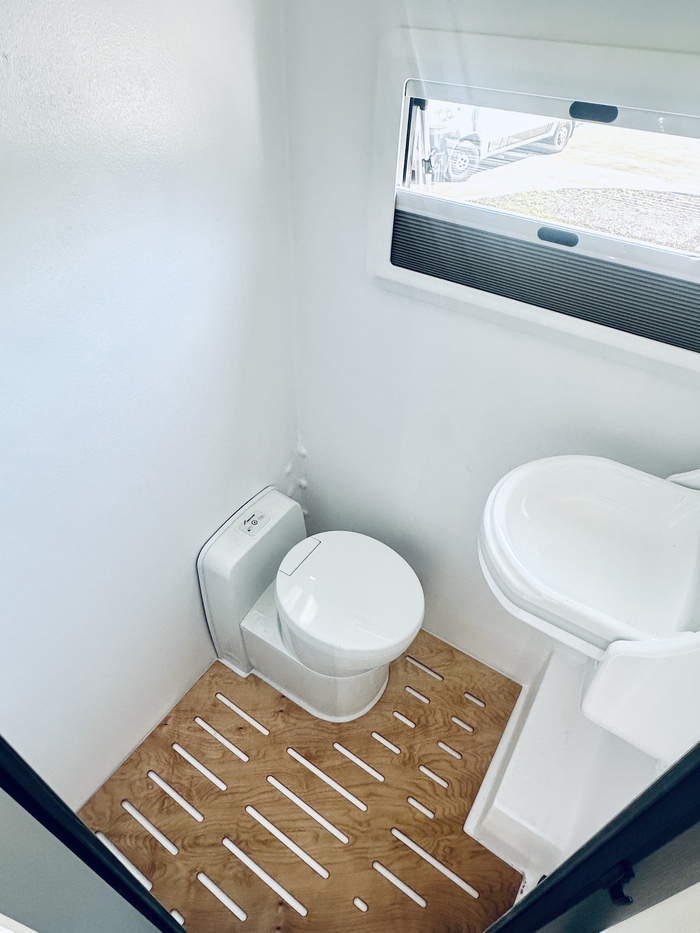 Ну и пятая зона это не менее важная в путешествии - санузел и туалет. Кстати, запас воды в автодоме 300 литров. Размеры душевой кабины 120х110 см.