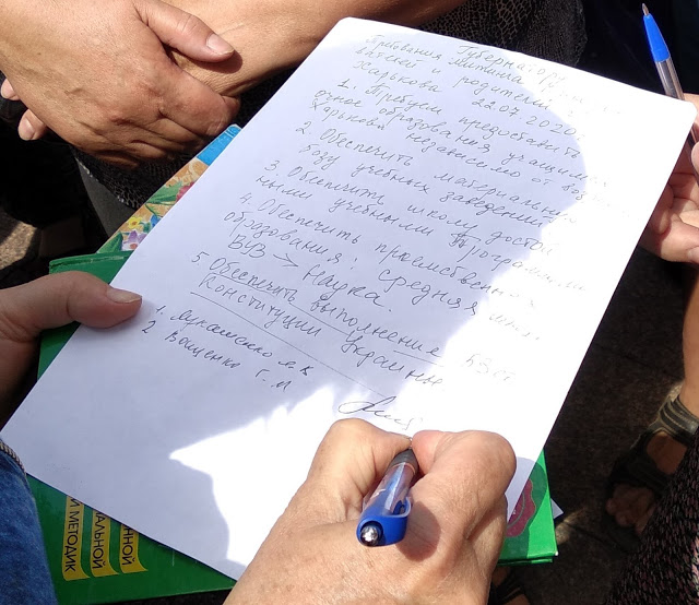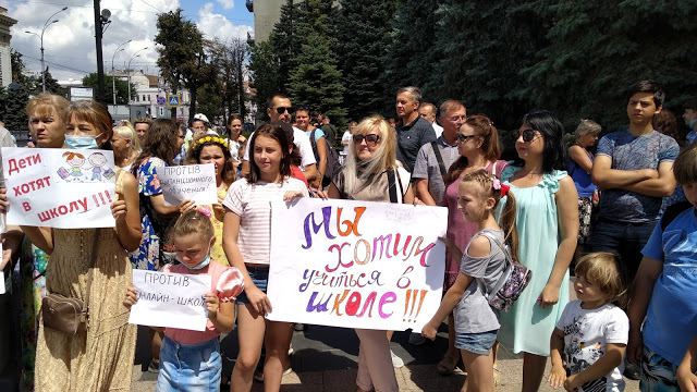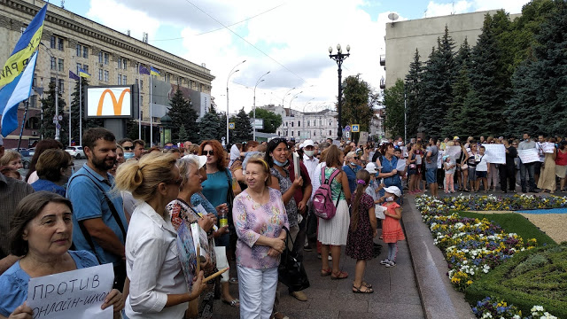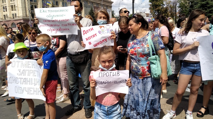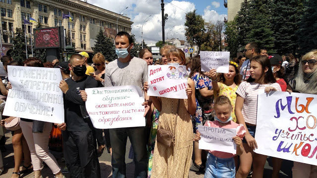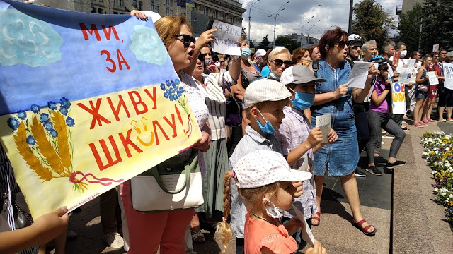 «ЗА ЖИВУЮ ШКОЛУ - НЕТ ДИСТАНЦИОННОМУ ОБРАЗОВАНИЮ» - с таким требованием 22 июля под зданиями местных администраций прошли многочисленные митинги по всей стране с протестом против введения с 1 сентября 2020 дистанционной формы обучения в общеобразовательных школах Украины.