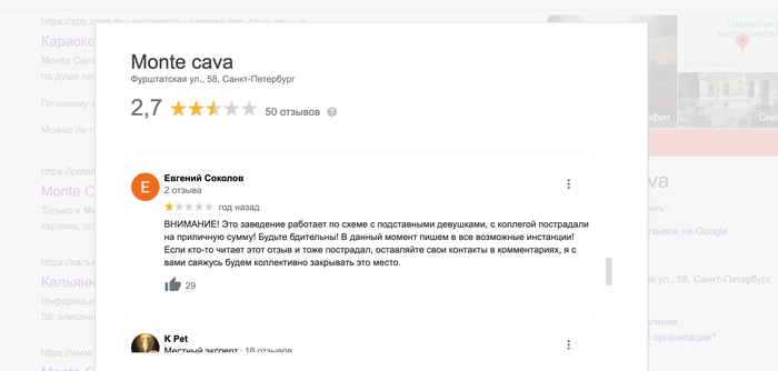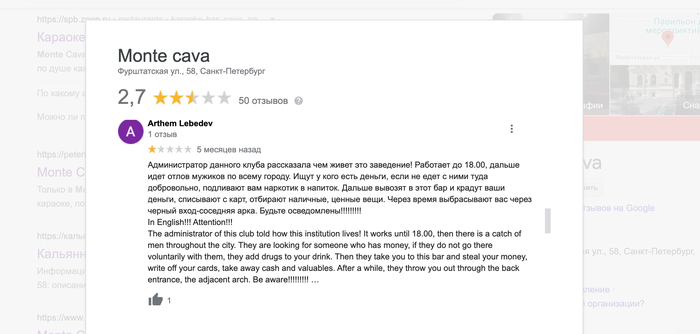 Девушки-экскортницы работают парами, заманивают выпивших людей именно в этот бар, водитель на темной машине тоже работает на этот бар с этими экскортницами. Бар-караоке находится по адресу улица Фурштатская, 58 Б, нынешнее название «Монтана» Названия часто меняются, старое название «Monte Cava»