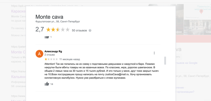 Прошу откликнуться тех, кто пострадал от действий Мошеннического Караоке-бара "MONTE CAVA" новое название "MONTANA" (СПБ, ул. Фурштатская 58Б) Свяжитесь с нами по адресу: