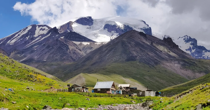 Южный склон закрывался на день профилактики, нам оставался только северный. Но там карты не рисовали ничего интересного. Поднявшись на «Северном сиянии», можно уйти влево до пика Смирнова. Ну, как пика: это абсолютно горизонтальная прогулка в шортах и шлепанцах (советую тем, кто хочет просто и ненапряжно, без физподготовки и снаряжения, получить горный восторг). Да, виды красивые. Но нам-то нужны реальные треки. И вдруг на сайте курорта вижу: от последней станции канатки можно пройти влево же до водопада (формат тоже «в шлепанцах»), а потом от него – до горного озера Габулу, и там уже высшая (по курортным меркам) сложность. То, что надо для первого акклиматизационного дня: курортные мерки наверняка легкие.