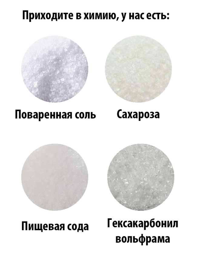 Внешний вид самого гексакарбонила вольфрама нельзя назвать примечательным - это белые нерастворимые в воде кристаллы, склонные к возгонке (температура плавления вещества 169°C; кипения 175°C), которые необходимо хранить в среде без доступа кислорода.