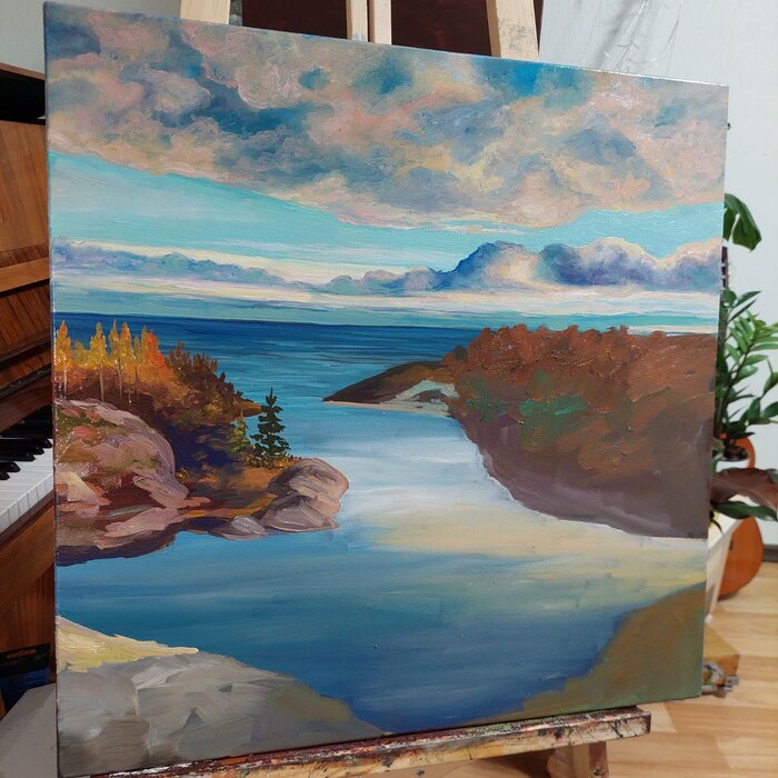 Ещё очень долго смотрел наши паспорта. Пролистал каждую страницу. А остальных он просто окинул взглядом и ушёл. Странно это было. У меня есть предположение, что мы слишком либерально выглядели среди полного автобуса взрослых работяг и пожилых людей. Выйдя из автобуса, добрались до скал мы через тучи комаров. Кусали даже сквозь одежду. Спрей от них не сильно спасал. Мне пришлось вылить на себя полфлакона, пока все руки и лицо с шеей не покрылись жирной пленкой, только тогда комары от меня отстали. По пути встречались грибы. Пожалели, что не взяли с собой лишнего пакета. Пришлось собирать в кепку. Долго ходили вокруг скалы, выбирал место. То поднимался на нее, то спускался обратно. В итоге нашел этот валун и приступил к работе. Для меня всегда первый этюд «разгоночный», следующие два выходят лучше. Но в этот раз написание этюда шло легко и непринужденно. Стоял серый пасмурный день. Освещение не менялось, особенно среди деревьев. И не приходилось играть на перегонки с солнцем. Редкий случай, когда этюд почти полностью вышел на натуре. Возможно, я бы его полностью дописал со всеми мелкими деталями, но нас спугнул собиравшийся дождь. Обратно до остановки шли под дождем, полностью вымокнув до последней нитки.