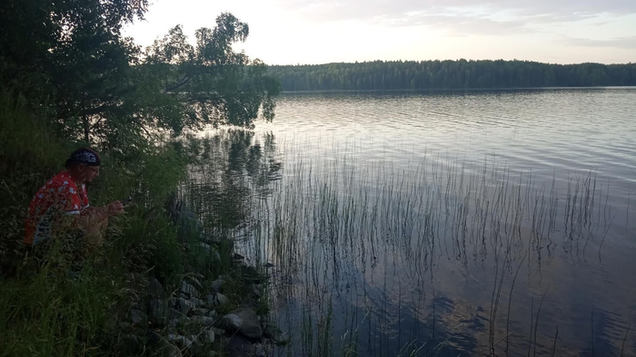В пятнадцати километрах вижу на карте два небольших озера по краям от дороги, к которым ведут грунтовки. Скорее всего, там уже есть люди, но сунуться надо попробовать, хотя бы съедем в лес, и то ладно. К озеру опять накатан целый автобан, видно, что место популярно у автомобилистов. На оборудованной стоянке уже кто-то ночует. Водная гладь манит, не отпуская пыльных и уставших туристов. Лезу прямо в дебри на противоположном берегу озера и нахожу что-то похожее на полянку или скорее просвет в зарослях. Нет, от этой воды меня просто так никто не оттащит. Лезем сюда со всем нашим добром. Ирина смотрит на это безобразие скептически, но ей уже всё равно, лишь бы лечь и вытянуть ноги. Решаю ещё немного пошарить кругом и, буквально в паре десятков метров, нахожу отличный пригорок с соснами, возвышающийся над озером, с которого можно спуститься прямо к воде, а на самой верхушке получится втиснуть палатку. Да о таком месте сегодня я даже и мечтать не мог!