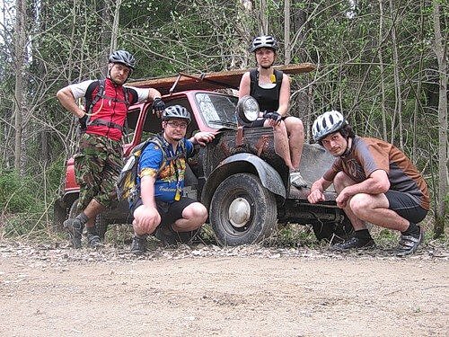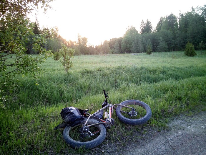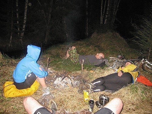 (Перед нами тут проводился ралли рейд джиперов, как оказалось, от чего многие дороги перестали быть дорогами). Как под утро у тропы валяется велосипед, а чуть дальше лежит тело велосипедиста и сладко спит. Как у с.Степанянское встретили несколько человек, сохнущие у костра и возбуждённо вещающих, что там их пытались остановить местные гопники.