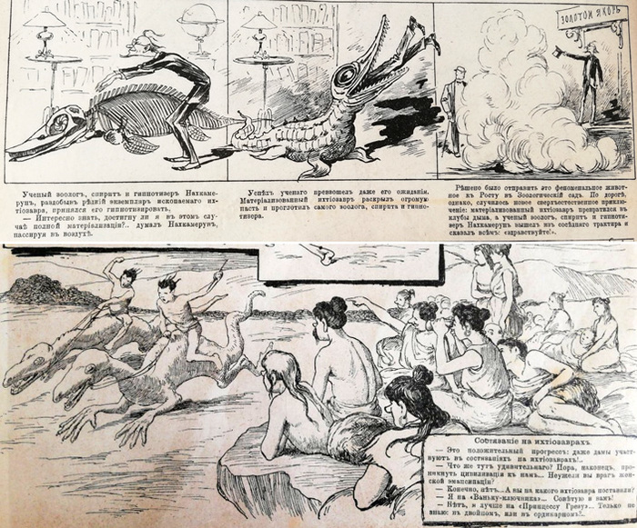В дореволюционных карикатурах среди вымерших животных преобладали ихтиозавры. Они в те годы были самыми популярными и известными доисторическими животными. Иллюстрации из журнала «Осколки» №26 за 1895 год и №9 за 1898 год