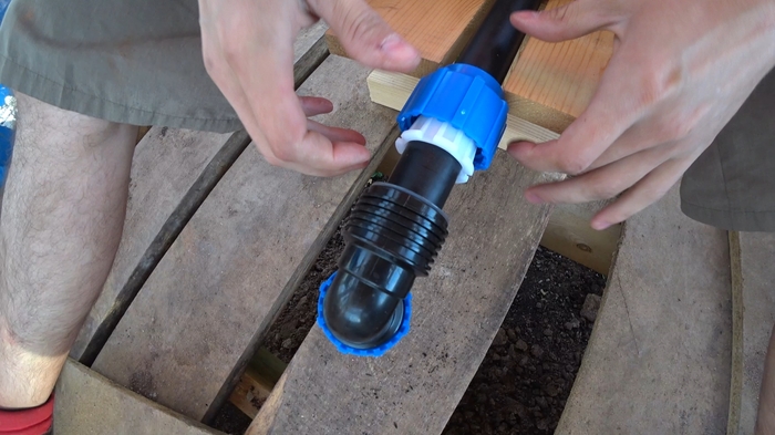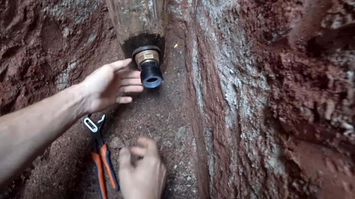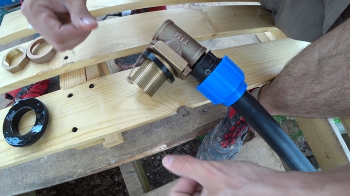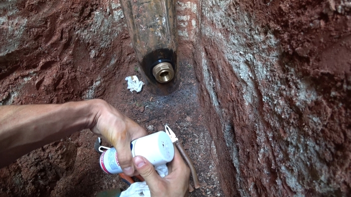Напорная магистраль начинается с компрессионной муфты, которая вкручивается в ответную часть скважинного адаптера. Для уплотнения резьбового соединения использовали фум-ленту. Так же можно использовать сантехнить, но только немного, иначе можно повредить пластиковую резьбу.