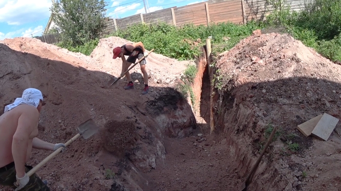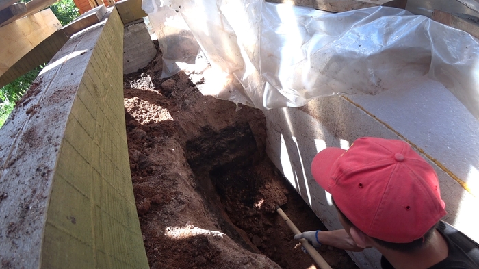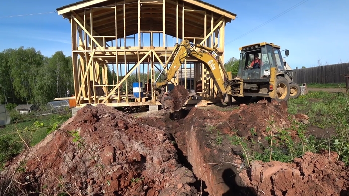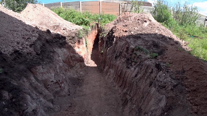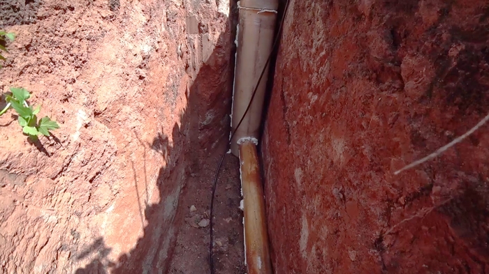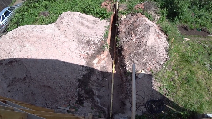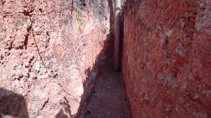 Для начала, необходимо выкопать траншею между скважиной и предполагаемой точкой ввода в доме. Точку ввода мы решили разместить в котельной, чтобы все инженерные системы находилась в одном месте.