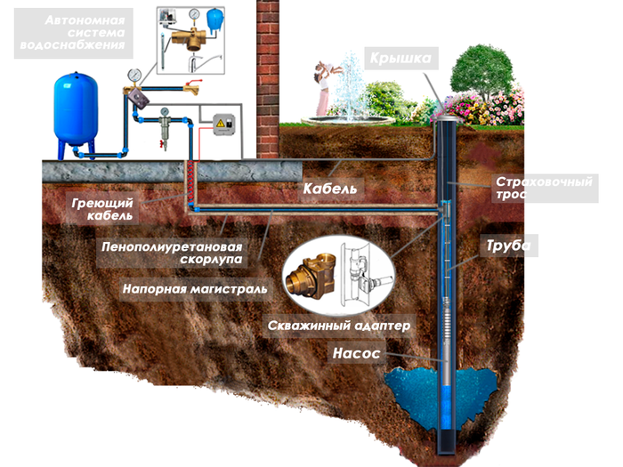 После завершения бурения скважины и её интенсивной прокачки можно переходить к монтажу системы автономного водоснабжения по схеме "скважина-дом".