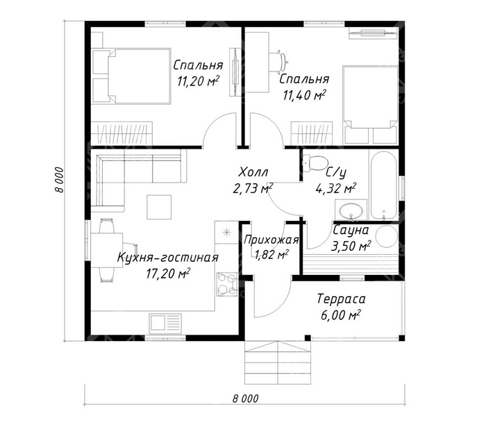 Квадратный, аккуратный и основательный, этот дом продолжает любимые мной скандинавские традиции. Простые формы, проверенная тысячелетиями двускатная крыша, зимнее утепление и площадь 58 м2. Планировка дома включает в себя две спальни по 11+ м2 и кухню-гостиную, площадь которой вместе с холлом составляет около 20 м2. Санузел 4+ м2 и небольшая сауна (опционально - гардеробная или техпомещение) площадью 3,5 м2. Ну и терраса 6 м2.