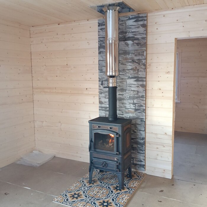 Аэродверь прошли - выполняем внутреннюю отделку. В качестве автономного отопления установлена и протестирована печь. Она легко обогреет весь этот дом. Но в перспективе заказчик планирует электрические тёплые полы.