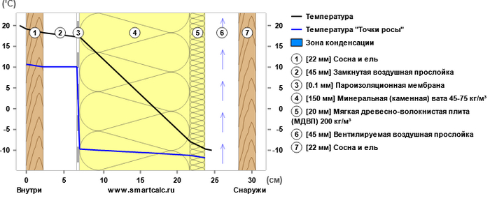 Теперь немного теории - почему этот дом будет тёплым. Посчитаем пирог стены и увидим, что его теплосопротивление составляет 3,53 (м²•˚С)/Вт, при Подмосковной норме 3,2 (м²•˚С)/Вт. То есть, с точки зрения отечественных норм, мы построили энергоэффективный дом.