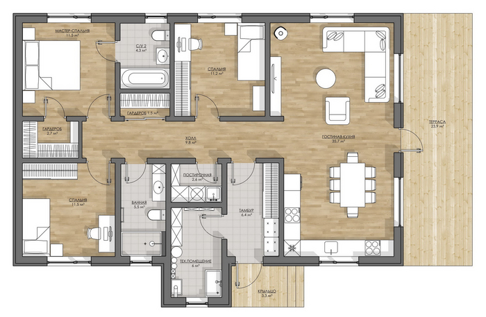 Нам удалось улучшить нашу линейку домов и сделать не один вариант, а несколько планировок с мастер-спальней. При этом мы оставили дом, в рамках площади чуть более 100 м².