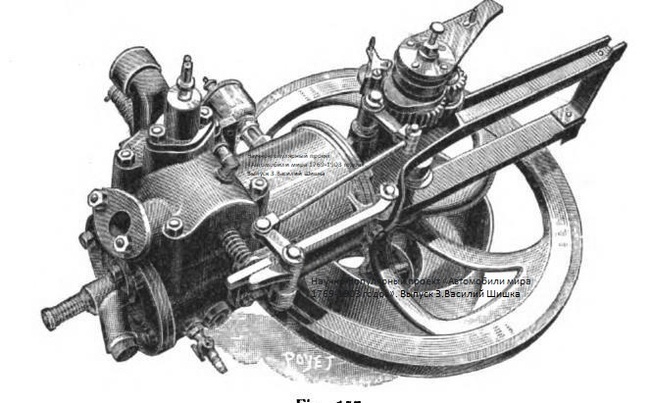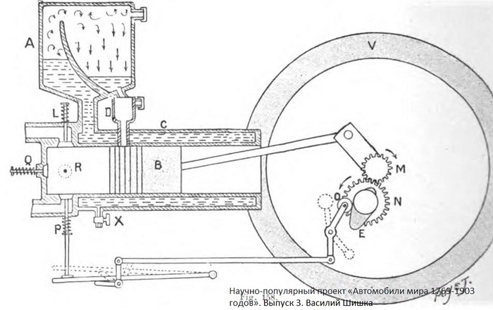 Горизонтальный цилиндр двигателя снабжен устройством для циркуляции охлаждающей воды – конденсационным цилиндром. Двигатель, с которым нам предстоит иметь дело, имеет диаметр цилиндра 100 мм, ход поршня - 120 мм. Мощность 1,5 л.с. при 300 об/мин. Автомобиль разгонялся до неспешных 19 км/ч, тогда как трицикл Леон Боллее «носился» со скоростью 30 км/ч.