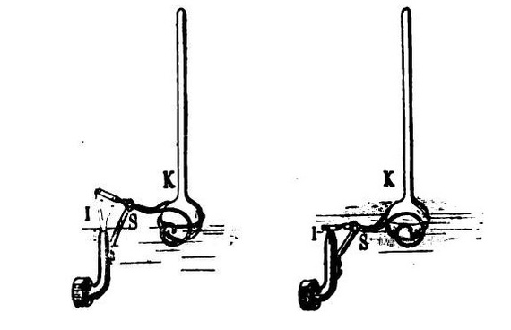 Внутри карбюратора на подающей бензин трубе навинчивается выступающий наконечник с узким отверстием, который загибается вверх. Рычаг, с закрепленным на одном конце поплавком (К), качается на оси (S). При повышении уровня бензина, поплавок поднимается, и плоский конец (I) закрывает торец наконечника (справа). Хм. Где-то мы видели подобную конструкцию? Точно, в бачке унитаза!