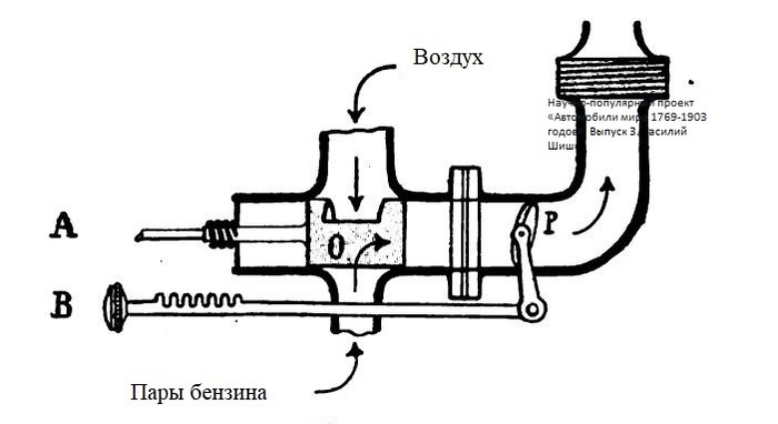 Для этой цели во впускной трубе установлен кран (О), предназначенный для регулирования качества, и заслонка (Р) для определения количества смеси. Смесь, образующаяся в карбюраторе, поступает через трубку, обозначенную «Пары бензина», в трехходовой кран (O). У него снизу есть отверстие для доступа паров бензина, а сверху для атмосферного воздуха. Вращая рукоятку (А) вокруг своей оси, можно добавить больше воздуха или паров бензина. Выражаясь современными терминами «обеднить» или «обогатить» смесь. Заслонка (Р) управлялась рычажком (В). Это аналог современной педали «газ». Если заслонка (Р) была в горизонтальном положении, то двигатель развивал полную мощность, если в вертикальном, то двигатель глох.