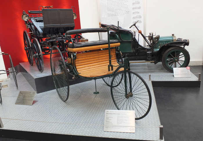 Автомобиль был построен в 1885 году и Карл Бенц дал ему - «Motorwagen». Это был трехколесный экипаж весом 265 кг на велосипедных колесах от фирмы Adler с трубчатой рамой; выбор трех колес объяснялся нерешенной тогда проблемой синхронного поворота передней пары. Его сердцем стал 0,9-сильный одноцилиндровый мотор объемом 954 см³, расположенный горизонтально над задней осью. Двигатель охлаждался водой, а его зажигание работало от батареи и катушки - революционное решение для эпохи паровых машин. Привод на задние колеса осуществлялся цепью, использовался дифференциал и ременное сцепление. Запускали мотор вручную, раскручивая маховик. Топливом служил лигроин (бензин), который тогда продавался в аптеках как чистящее средство.