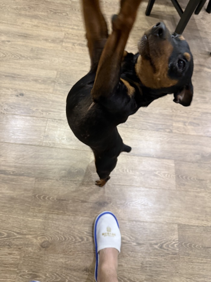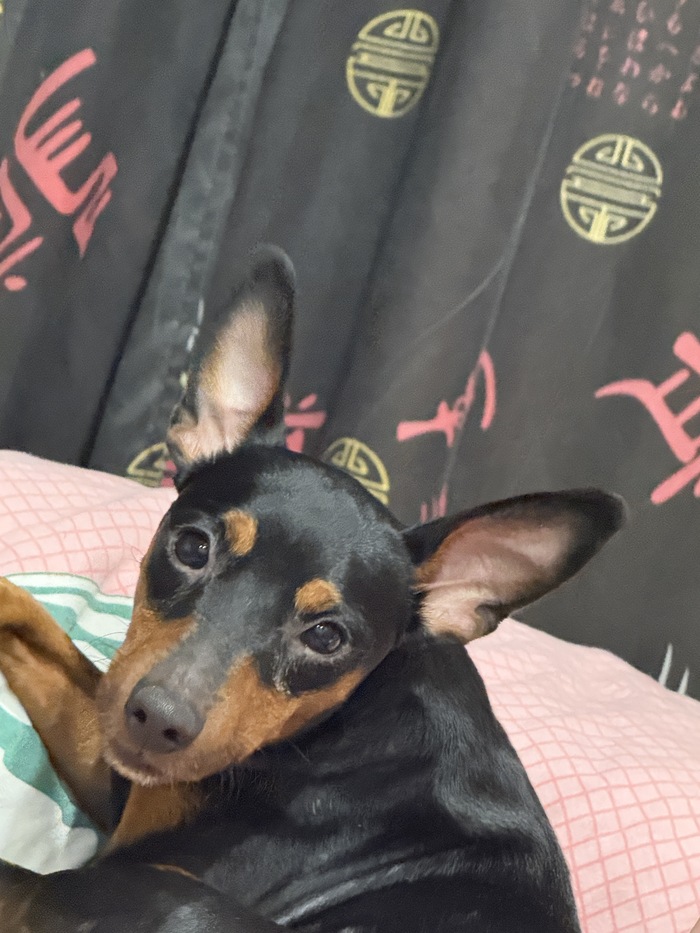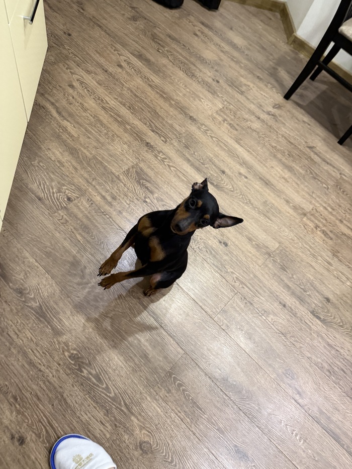 Карликовый пинчер, возможно, метис. Был подобран на трассе, старые хозяева не найдены. Верный друг, очень привязан к людям. Серьезный, бдительный охранник, но всегда готов повеселиться и отправиться на прогулку :)