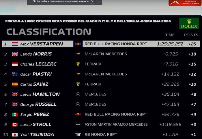 Ну и нельзя не отметить пир во второй половине очковой зоны. «Aston Martin» добились лучшего результата в сезоне, набрав 14 очков двумя гонщиками. Алонсо не боролся с лидерами, но уверенно отсек всех, начиная с седьмого места. Домашнего успеха добился и Стролл - уверенные 6 очков без единой ошибки. Восьмое место все же оставил за собой Риккиардо, что стало его первыми очками в большой гонке в сезоне. Ну и совсем уж чудо для Alpine - и Гасли, и Окон финишировали в топ-10, правда, вновь не без скандала. Окон за несколько кругов до финиша пустил партнера для атаки на Дэна, Пьер не справился, но позицию не вернул.