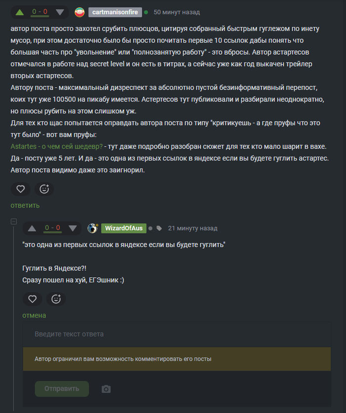 И конечно с запахом пригоревших ягодиц @WizardOfAus (хотя мне кажется буква N в последнем слове пропущена) решил заблокировать мне возможность комментировать его же посты (как же бесит эта функция - пикабу загнивает и т.п.), но при этом не скромничал в выражениях в мою сторону. Собственно т.к. конструктивно ответить в его же посте на его ругань я теперь не могу - отвечу публично и по пунктам: